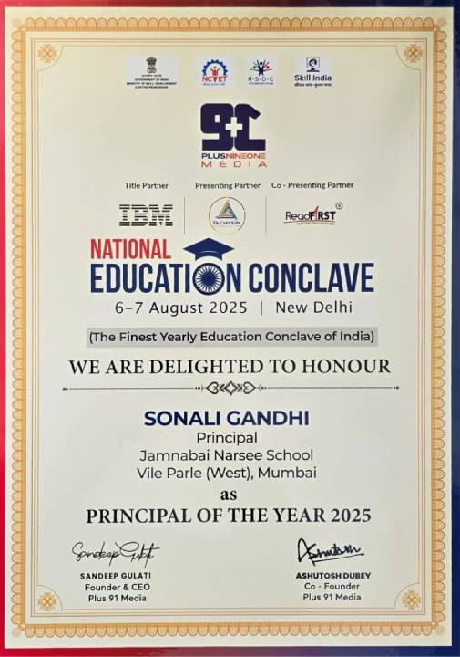 Principal Ms. Sonali Gandhi was awarded the Principal of the Year 2025 at the National Education Conclave held in New Delhi.
