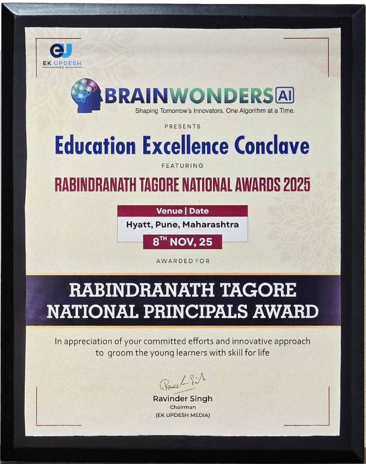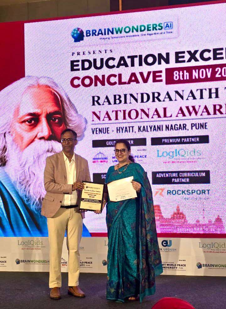 Principal Ms. Sonali Gandhi was presented the Rabindranath Tagore National Principals Award at the Education Excellence Conclave held in Pune. This award is in recognition for her unwavering commitment and dynamism in shaping and moulding young minds to achieve excellence in all endeavours.
